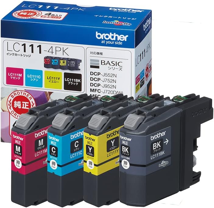 ブラザー LC111-4PKとは、ブラザー工業が製造・販売するインクジェットプリンター用の純正インクカートリッジで、ブラック・シアン・マゼンタ・イエローの4色がセットになったパック商品です。各色の品番はLC111BK(ブラック)、LC111C(シアン)、LC111M(マゼンタ)、LC111Y(イエロー)となっており、この4色をまとめて購入できるのがLC111-4PKの大きな特徴です。バラで購入するよりも割安になる場合が多く、インクを一括で補充したい方にとって便利なパックとして評判を集めています。