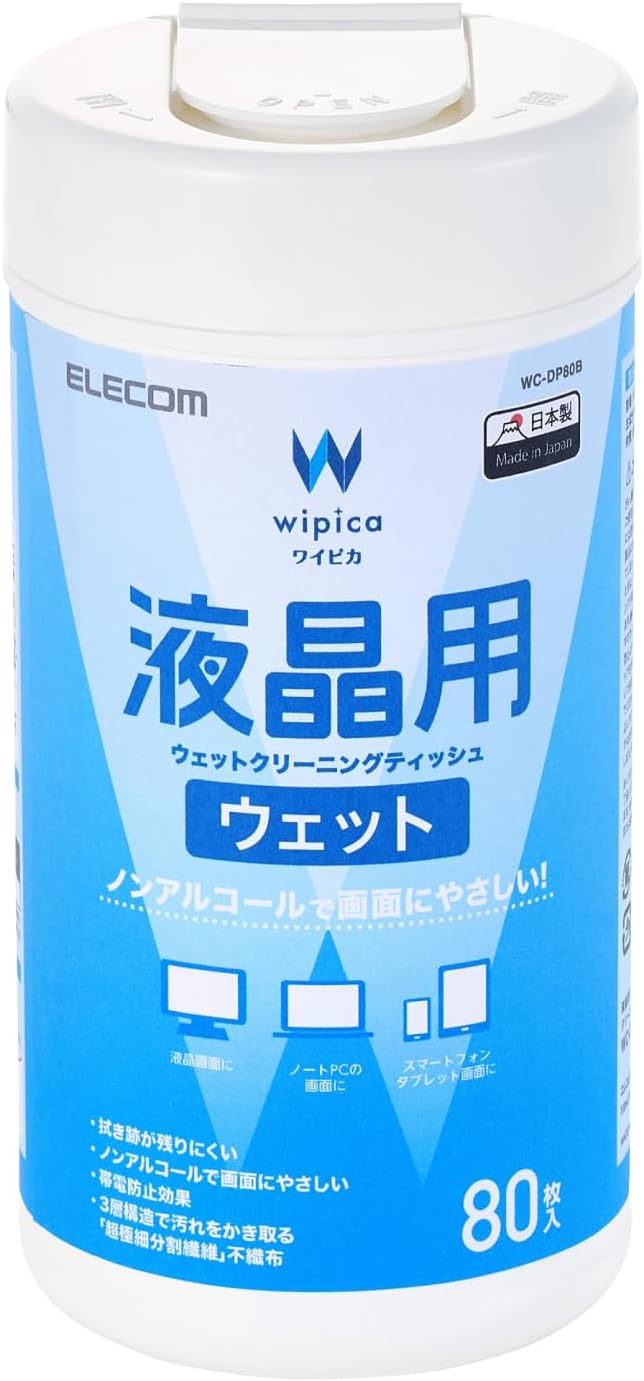 エレコム WC-DP80Bとは、エレコム株式会社が発売している「液晶用ウェットクリーニングティッシュ ボトルタイプ 80枚入り」のことです。型番末尾の「B」はボトルタイプを意味しており、デスクの上に立てて設置できる実用的なデザインが採用されています。