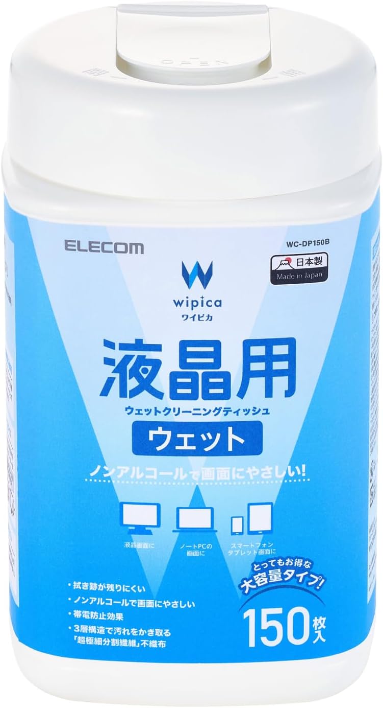 エレコム WC-DP150Bは、液晶画面専用のノンアルコール・ウェットクリーニングティッシュとして、発売以来高い評判を得ている製品です。150枚入りのボトルタイプで、スマートフォンやタブレット、PCモニター、液晶テレビなど幅広いデバイスの画面を安全にクリーニングできます。実際のユーザーからは「旧モデルより柔らかくなった」「拭き跡が残らない」「コスパが良い」といった好意的な声が多く寄せられており、液晶クリーナー選びで迷っている方にとって有力な選択肢となっています。